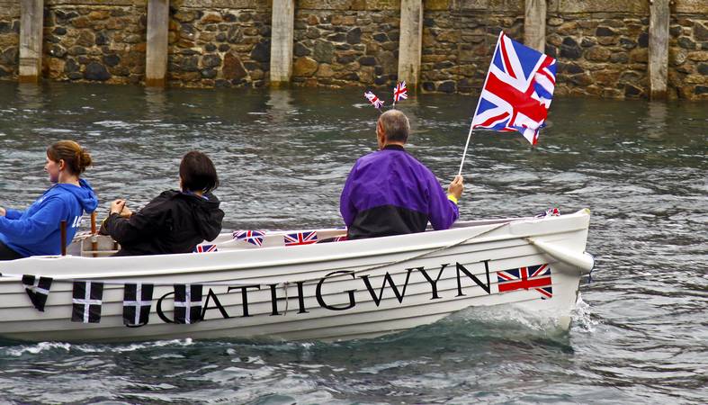 Gathering by Looe bridge, small boats, ribs, gigs and kayaks start to parade down river.